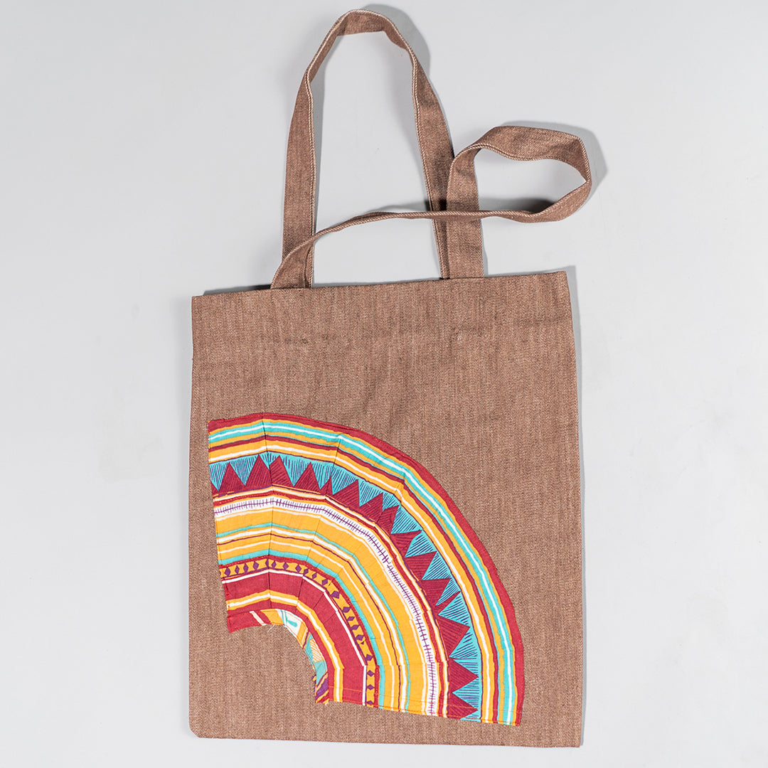 The Baadal Tote is a celebration of craft, color, and quiet ingenuity. Hand-appliquéd on upcycled brown canvas, the sweeping half-circle design draws inspiration from traditional Chinese fans — stitched from fabric saved from old Eastern-wear shirts and soft cotton textiles. Bold patterns in red, yellow, teal, and maroon are arranged in a rhythmic arc, making each piece feel like wearable heritage.