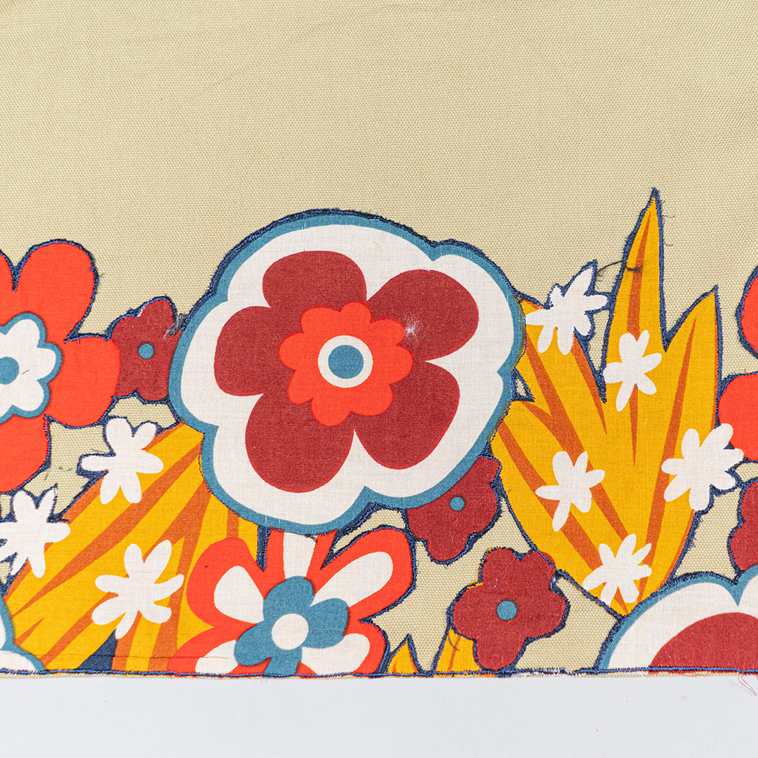 the Bahaar Tote bursts with joy and intention. Made from upcycled green canvas, this tote features a vibrant field of hand-appliquéd florals in bold reds, whites, orange, and teal. Each motif was rescued from cotton fabric scraps and stitched with care — giving new life to forgotten cloth.