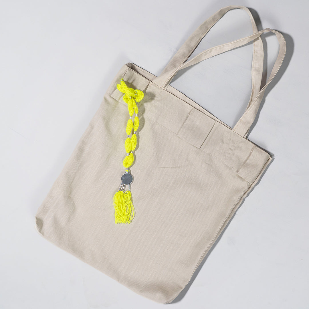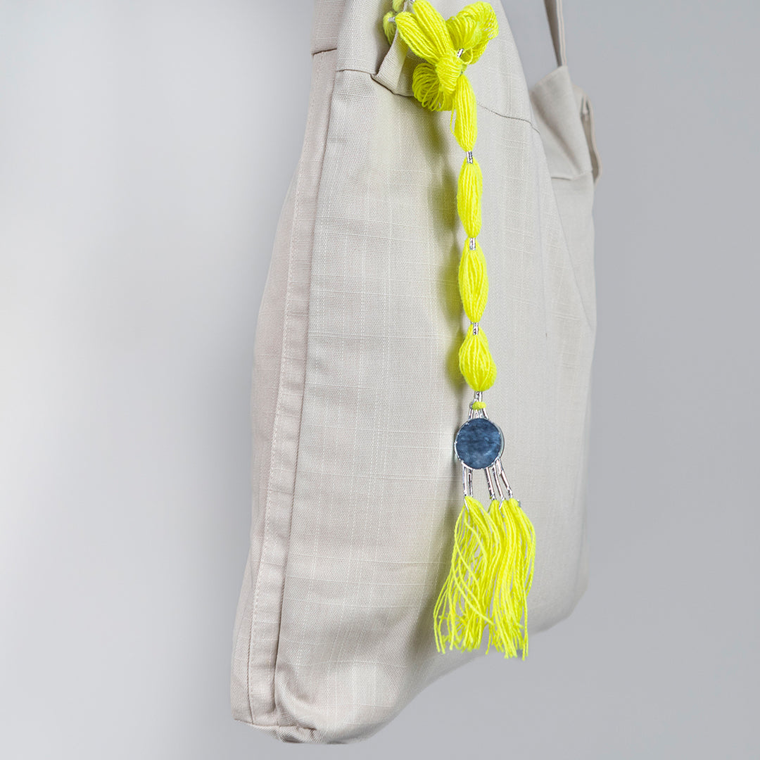 “Bijli” means electricity in Urdu — a nod to the electric yellow tassel that brings this one-of-a-kind tote to life.