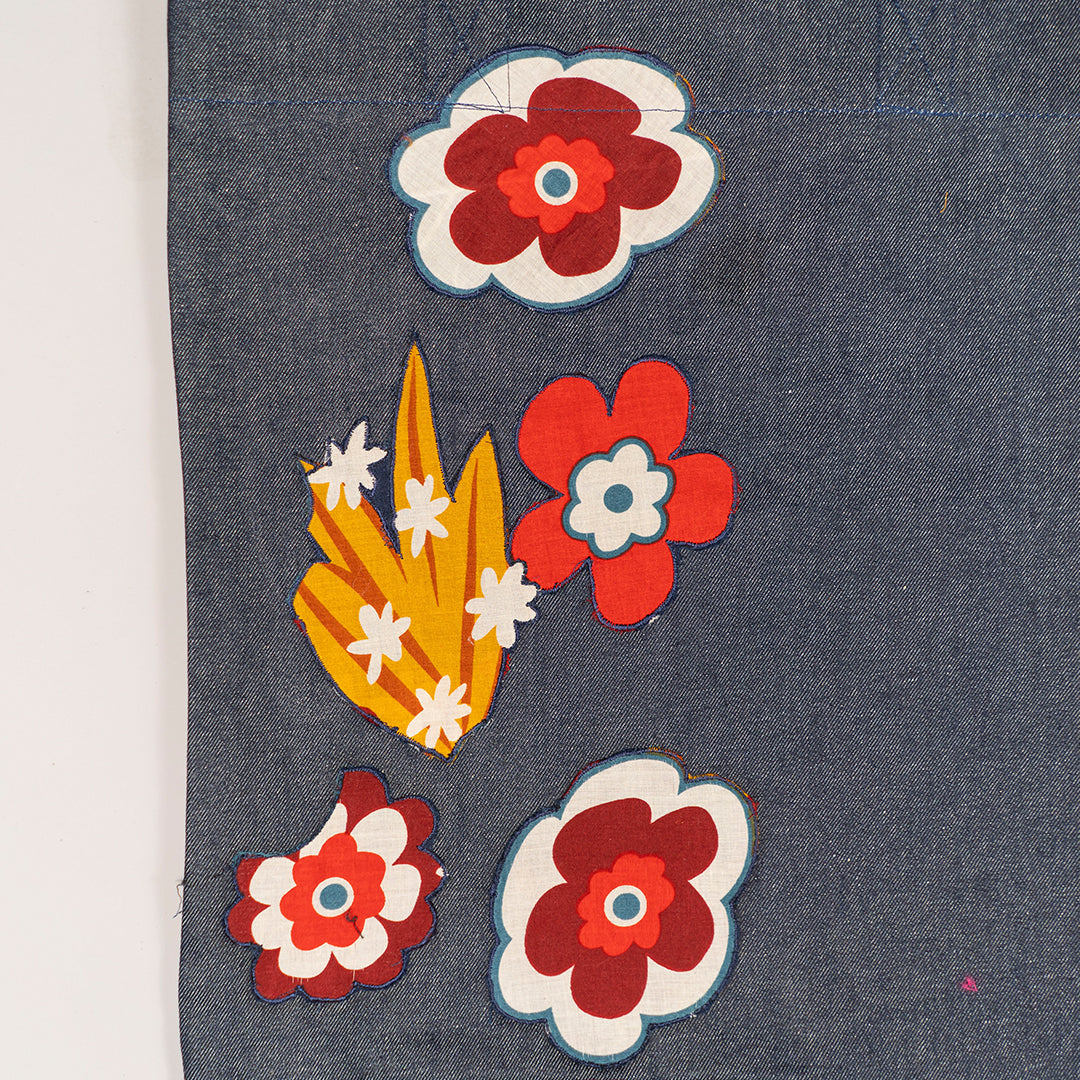 The Gulbahar Tote is joyful, bright, and made with purpose. Cut from sturdy rescued denim in a deep grey tone, this one-of-a-kind tote is hand-appliquéd with retro-inspired floral motifs in warm reds, crisp whites, and a pop of yellow. The appliqué fabrics are upcycled from discarded textiles, lovingly stitched to give them a new life in bloom.