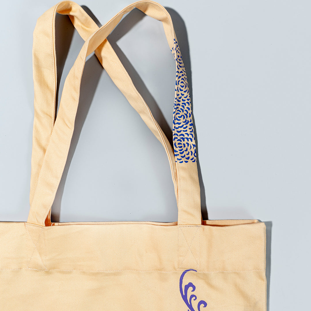 Hand block-printed on rescued canvas, this one-of-a-kind tote features a graceful diagonal floral design with printed detailing on the handles. The soft peach tone brings a subtle vibrance, while the blockprint technique reflects timeless South Asian craftsmanship.