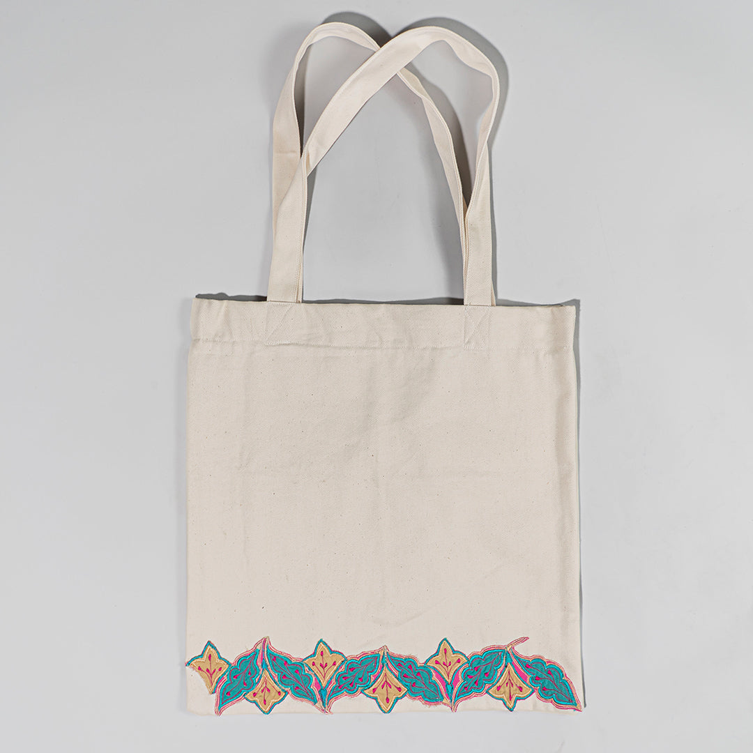 The Meherbaan Tote is grace in motion. Crafted from upcycled cream canvas, it features a delicate border of leaf motifs appliquéd in vivid teal, mustard, and rose pink — stitched from salvaged cotton fabrics, each shape placed by hand. The repeating vine-like pattern flows across the bottom, adding subtle elegance and a touch of heritage to this otherwise minimal tote.