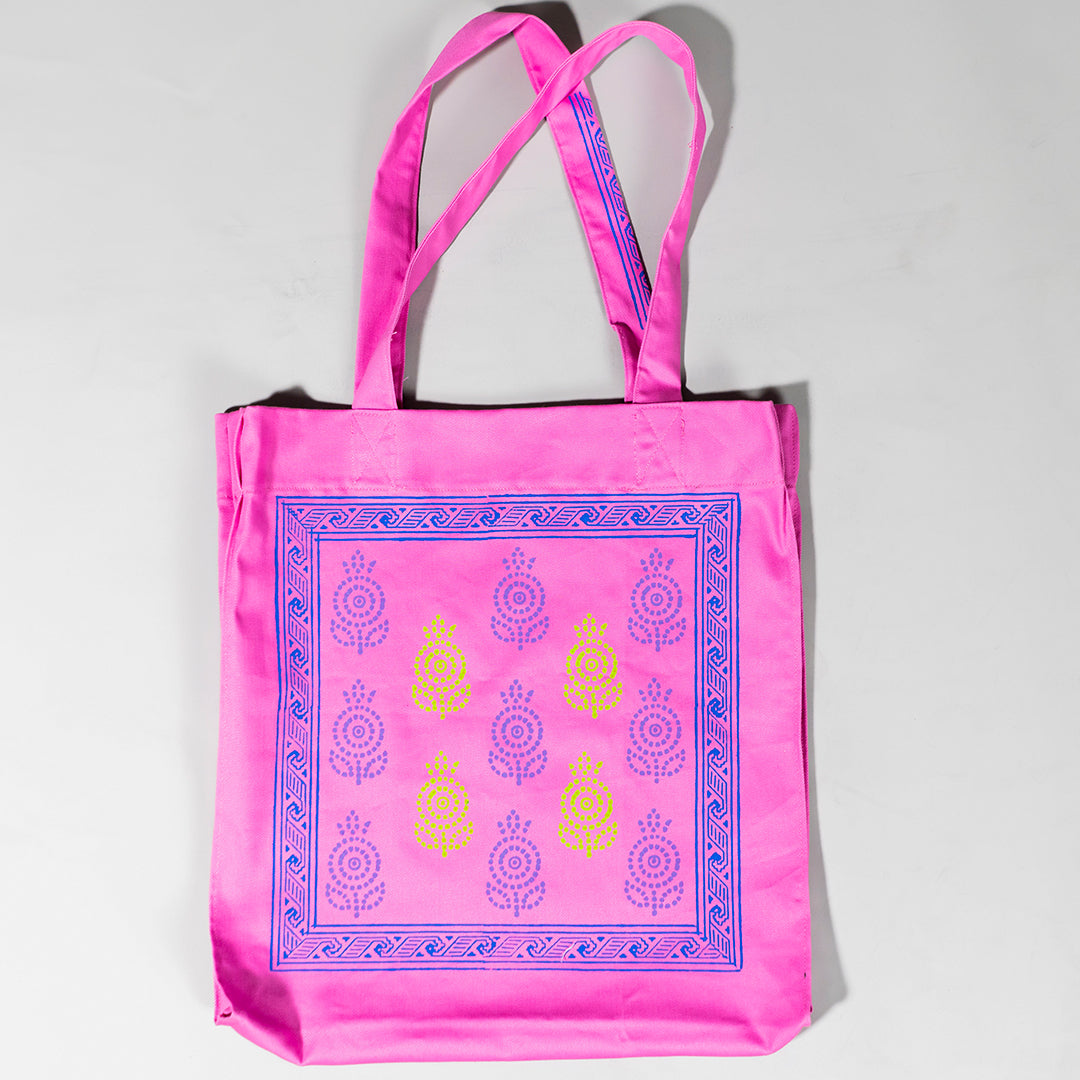 The Roshnai Blockprint Tote is a spacious capacity bag crafted from vibrant pink upcycled canvas, featuring a luminous block-printed panel in the center. The layout combines lime yellow floral emblems with indigo accents, arranged in a balanced grid framed by an intricate geometric border — echoed on the inside of the straps for extra flair.